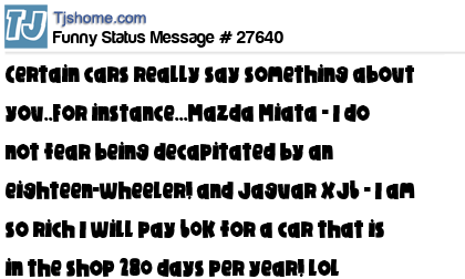 X Certain cars really say something about you..For instance...Mazda Miata - I do not fear being decapitated by an eighteen-wheeler! and Jaguar XJ6 - I am so rich I will pay 60K for a car that is in the shop 280 days per year! lol