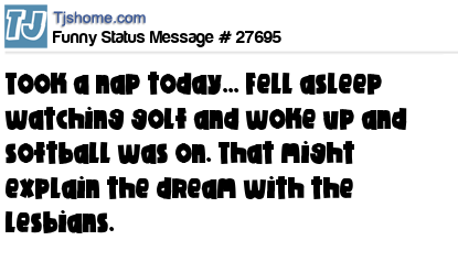 X Took a nap today... Fell asleep watching golf and woke up and softball was on. That might explain the dream with the lesbians.