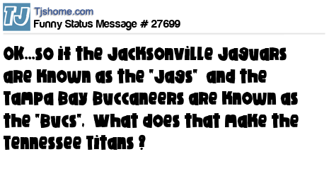 - # 135135 So if the Jacksonville Jaguars are known as the “Jags” and the Tampa Bay Buccaneers are known as the “Bucs,” what does that make the Tennessee Titans?