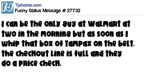 X I can be the only guy at Walmart at two in the morning but as soon as I whip that box of Tampax on the belt, the checkout line is full and they do a price check.