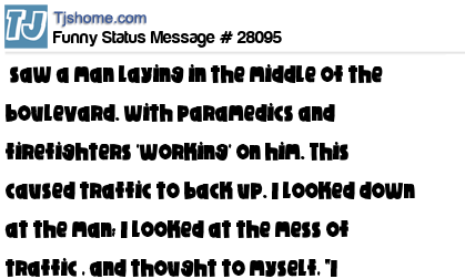 X saw a man laying in the middle of the boulevard. with paramedics and firefighters 'working' on him. This caused traffic to back up. I looked down at the man; I looked at the mess of traffic , and thought to myself, "I really hate traffic"!