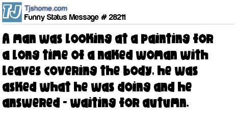 X A man was looking at a painting for a long time of a naked woman with leaves covering the body, he was asked what he was doing and he answered - waiting for autumn.