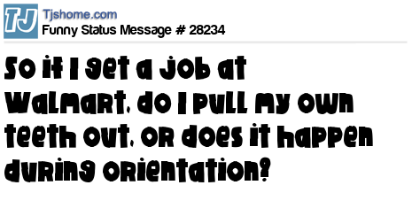 - # 114513 So if I get the job at Walmart,,, do I pull my own teeth out,, or does it happen during orientation ?
