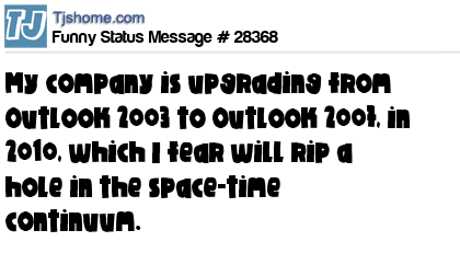 X says my company is upgrading from Outlook 2003 to Outlook 2007, in 2010, which I fear will rip a hole in the space-time continuum.