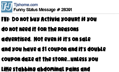 X FYI: Do not buy Activia yogurt if you do not need it for the reasons advertised. Not even if it's on sale and you have a $1 coupon and it's double coupon daze at the store...unless you like stabbing abdominal pains and blaming lots of stuff on the dog.