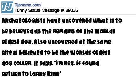 X says Archaeologists have uncovered what is to be believed as the remains of the worlds oldest dog. Also uncovered at the same site is believed to be the worlds oldest dog coller. It says, "i'm rex, if found return to Larry King"
