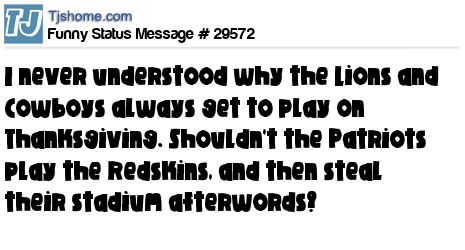- # 80647 will never understand why the Lions and Cowboys always get to play on Thanksgiving. Shouldn't the Patriots play the Redskins, and then steal their stadium?