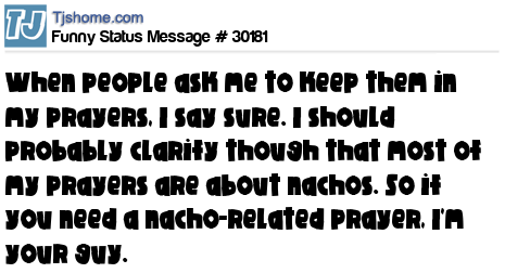 X When people ask me to keep them in my prayers, I say sure. I should probably clarify though that most of my prayers are about nachos. So if you need a nacho-related prayer, I'm your guy.