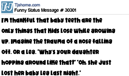 - # 34804 I'm thankful that baby teeth are the only things that kids lose while growing up. Imagine the trauma of a nose falling off. Or a leg. "Why's your daughter hopping around like that?" "Oh, she just lost her baby leg last night...."