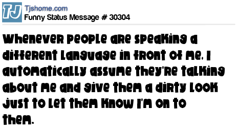 X Whenever people are speaking a different language in front of me, I automatically assume they're talking about me and give them a dirty look just to let them know I'm on to them.