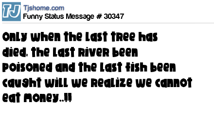 - # 92773 Only when the last tree has died and the last river been poisoned and the last fish been caught will we realise WE CANNOT EAT MONEY.. look at whats happening with Belo Monte dam in Brazil