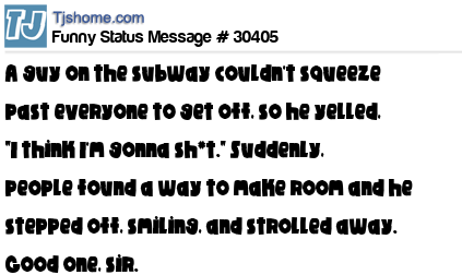 X A guy on the subway couldn't squeeze past everyone to get off, so he yelled, "I think I'm gonna sh*t." Suddenly, people found a way to make room and he stepped off, smiling, and strolled away. Good one, sir.