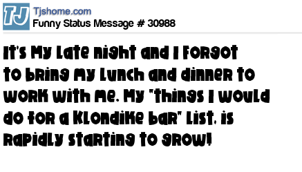 X is It's My late night and I Forgot to bring my lunch and dinner to work with me. My "things I would do for a Klondike bar" list, is rapidly starting to grow!