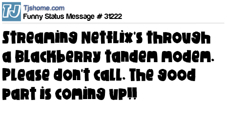X is streaming Netflix's through a Blackberry tandem modem. Please don't call. The good part is coming up!!