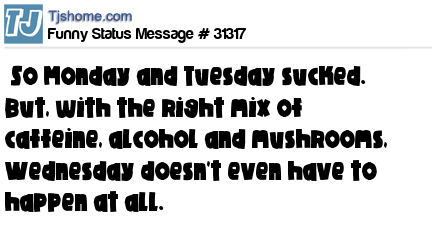 - # 64582 A lot of people constantly complain about Monday's, Tuesday's and Wednesday's being the worst part of the week, I have discovered that with the right mix of Jack Daniels and sleeping pills those days no longer have to happen.