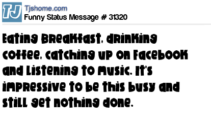X Eating Breakfast, drinking coffee, catching up on Facebook and listening to music. It's impressive to be this busy and still get nothing done.