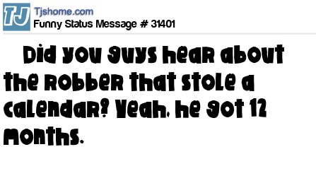 X Did you guys hear about the robber that stole a calendar? Yeah, he got 12 months.