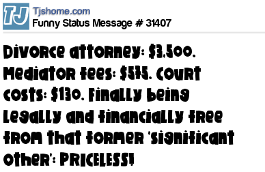 X  Divorce attorney: $3,500. Mediator fees: $575. Court costs: $130. Finally being legally and financially free from that former 'significant other': PRICELESS!