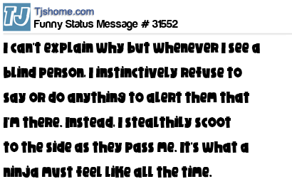 X  I can't explain why but whenever I see a blind person, I instinctively refuse to say or do anything to alert them that I'm there. Instead, I stealthily scoot to the side as they pass me. It's what a ninja must feel like all the time.