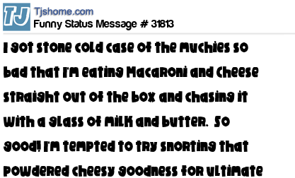X I got stone cold case of the muchies so bad that I'm eating Macaroni and Cheese straight out of the box and chasing it with a glass of milk and butter. So good! I'm tempted to try snorting that powdered cheesy goodness for ultimate processed food high.