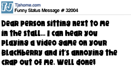 X Dear person sitting next to me in the stall... I can hear you playing a video game on your Blackberry and it's annoying the crap out of me. Well done!
