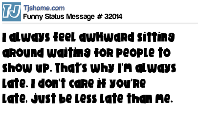 X I always feel awkward sitting around waiting for people to show up. That's why I'm always late. I don't care if you're late, just be less late than me.