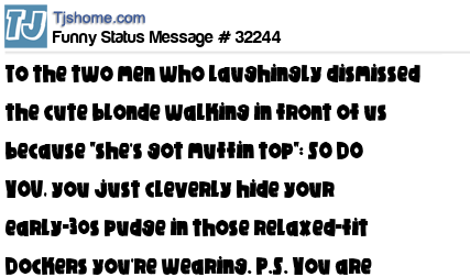 X says to the two men who laughingly dismissed the cute blonde walking in front of us because "she's got muffin top": SO DO YOU, you just cleverly hide your early-30s pudge in those relaxed-fit Dockers you're wearing. P.S. You are balding.