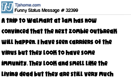 X is A trip to Walmart at 3am has now convinced that the next zombie outbreak will happen. I have seen carriers of the virus but they look to have some immunity. They look and smell like the living dead but they are still very much alive.