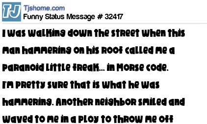 X I was walking down the street when this man hammering on his roof called me a paranoid little freak... in Morse code. I'm pretty sure that is what he was hammering. Another neighbor smiled and waved to me in a ploy to throw me off about the hammer signals