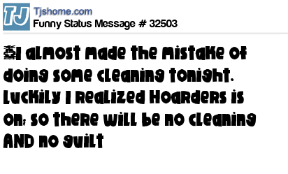 X ~I almost made the mistake of doing some cleaning tonight. Luckily I realized Hoarders is on; so there will be no cleaning AND no guilt