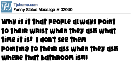 X says Why is it that people always point to their wrist when they ask what time it is? I don't see them pointing to their ass when they ask where that bathroom is!!!