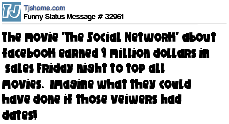 X says The movie "The Social Network" about facebook earned 9 million dollars in sales Friday night to top all movies. Imagine what they could have done if those veiwers had dates!