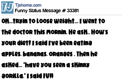 X is Ok...tryin to loose weight... I went to the doctor this mornin. He ask.. How's your diet? I said I've been eating apples, bananas, oranges . Then he asked... "have you seen a skinny gorilla," I said FU!!