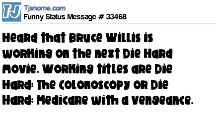 X heard that Bruce Willis is working on the next Die Hard movie. Working titles are Die Hard: The Colonoscopy or Die Hard: Medicare with a Vengeance.