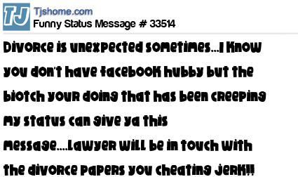 X says divorce is unexpected sometimes...I know you don't have facebook hubby but the biotch your doing that has been creeping my status can give ya this message....lawyer will be in touch with the divorce papers you cheating jerk!!