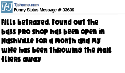 X Fills betrayed. Found out the bass pro shop has been open in Nashville for a month and my wife has been throwing the mail fliers away