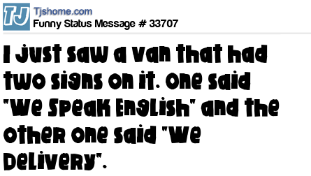 X I just saw a van that had two signs on it. One said "We Speak English" and the other one said "We Delivery".