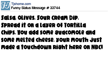 X Salsa, Olives, Sour Cream Dip, Spread it on a layer of Tortilla Chips, You add some guacomole and some melted cheese, your mouth just made a touchdown right here on NBC!