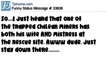 X So....I just heard that one of the trapped Chilean miners has both his wife AND mistress at the rescue site. Awww dude, just stay down there.........