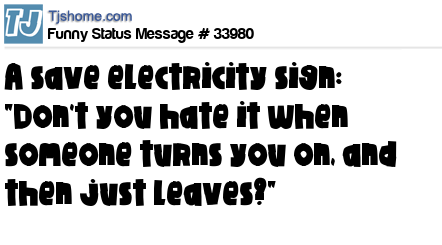 - # 37114 Apparently it's green week. In an effort to contribute, I just created a save electricity sign: "Don't you hate it when someone turns you on, and then just leaves?"