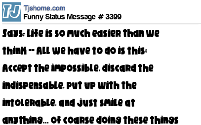 X says; Life is so much easier than we think -- All we have to do is this: Accept the impossible, discard the indispensable, put up with the intolerable, and just smile at anything... of coarse doing these things is so much easier on drugs :)