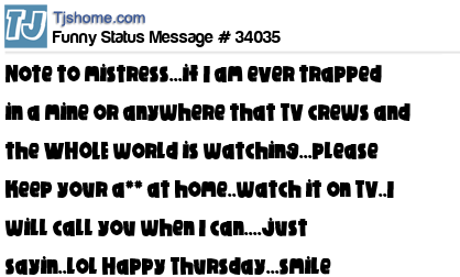 X is note to mistress...if I am ever trapped in a mine or anywhere that TV crews and the WHOLE world is watching...please keep your a** at home..watch it on TV..I will call you when I can....just sayin..lol Happy Thursday...smile