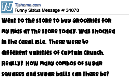 X Went to the store to buy groceries for my kids at the store today. Was shocked in the Ceral Isle. There were 40 different varities of Captain Crunch. Really? How many combos of sugar squares and sugar balls can there be?