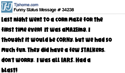 X says Last night went to a corn maze for the first time ever! It was aMAZEing. I thought it would be CORNy, but we had so much fun. They did have a few STALKers, don't worry, I was all EARS. Had a blast!