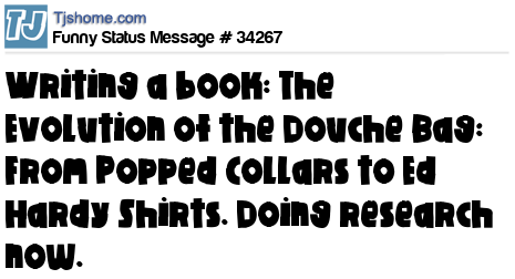 X Writing a book: The Evolution of the Douche Bag: From Popped Collars to Ed Hardy Shirts. Doing research now.