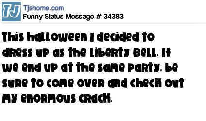 X is This halloween I decided to dress up as the Liberty Bell. If we end up at the same party, be sure to come over and check out my enormous crack.