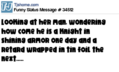 X is looking at her man, wondering how come he is a knight in shining armor one day and a retard wrapped in tin foil the next.....