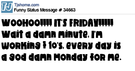 X WOOHOO!!!! IT'S FRIDAY!!!!! Wait a damn minute, I'm working 7 10's, every day is a god damn Monday for me.