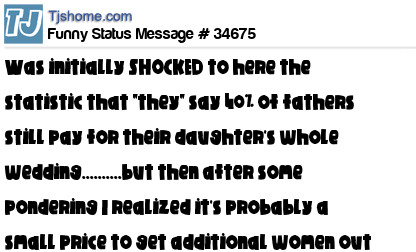 X was initially SHOCKED to here the statistic that "they" say 40% of fathers still pay for their daughter's whole wedding..........but then after some pondering I realized it's probably a small price to get additional women out of the house.......