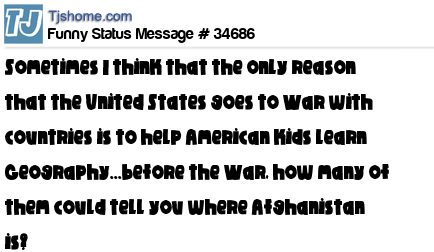 X Sometimes I think that the only reason that the United States goes to War with countries is to help American kids learn Geography...before the War, how many of them could tell you where Afghanistan is?